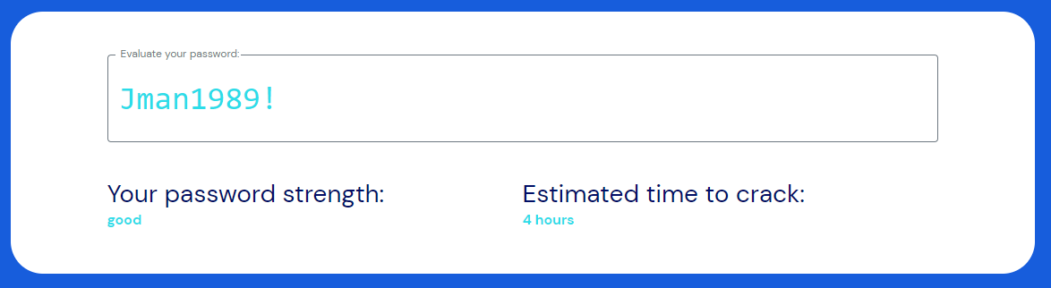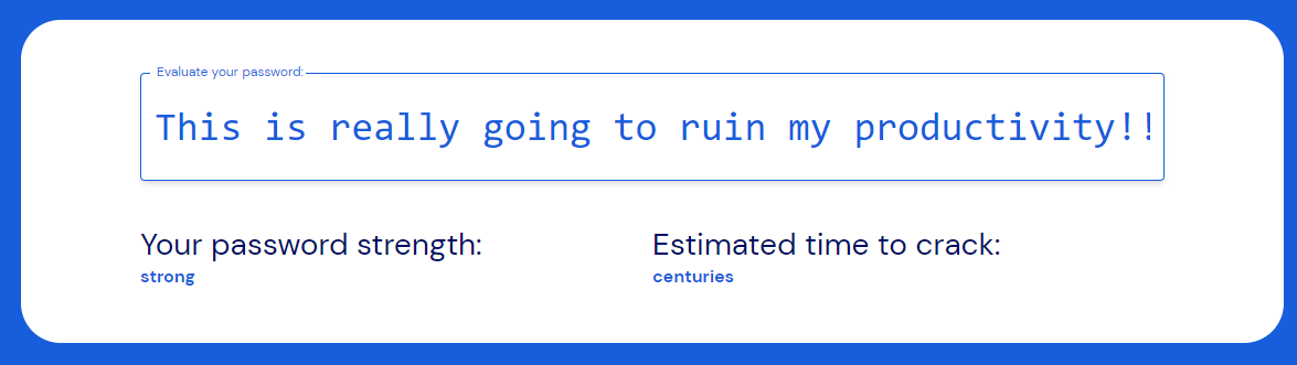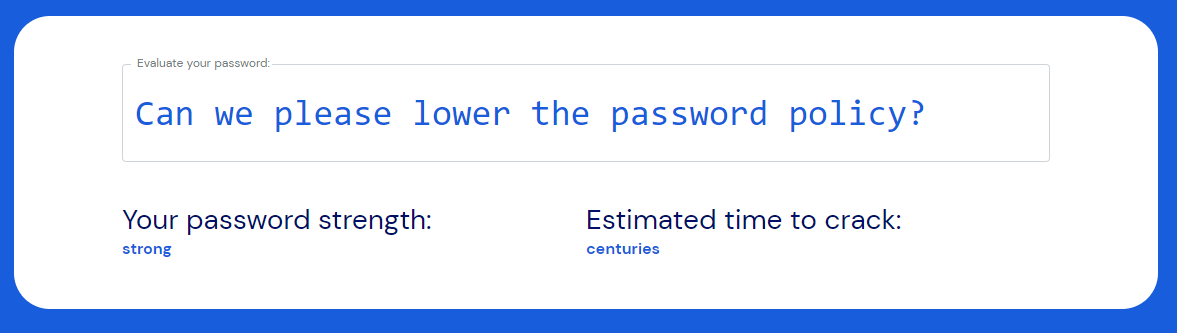 A simple passphrase brings our character count to 41 (spaces count as characters!), while also including a symbol to meet password strength requirements. This is a simple phrase that is rather easy to remember but nearly impossible to guess, and even more impossible to crack anytime this decade.