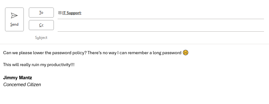 This phrase seems to meet our requirements! It's longer than 15 characters (it's 40!), it has uppercase and lowercase letters, and it includes at least 1 special character. I bet I could remember how to type this on a daily basis. What else can we do with this e-mail?